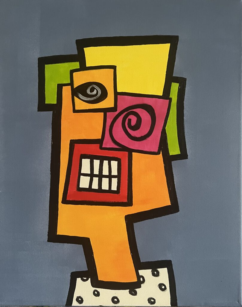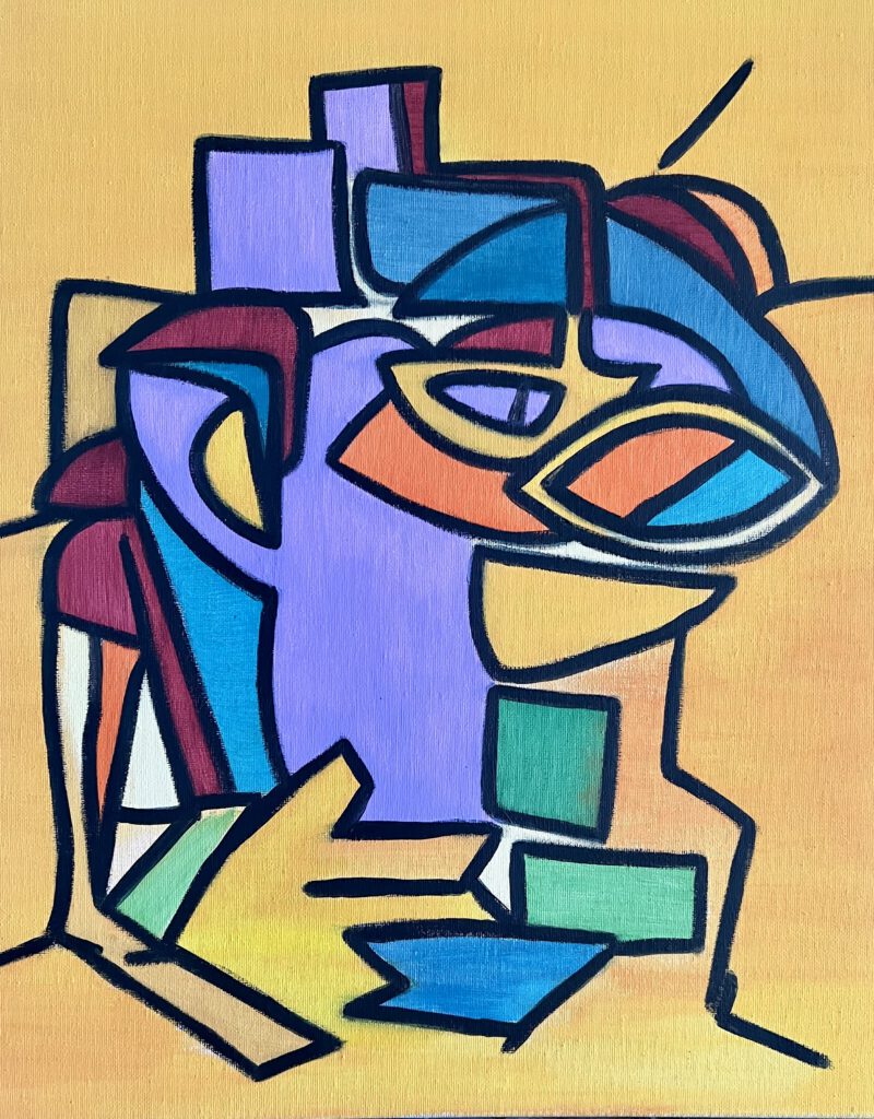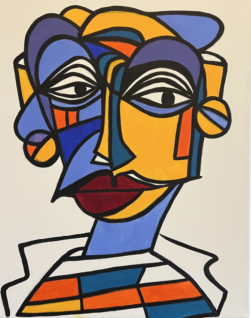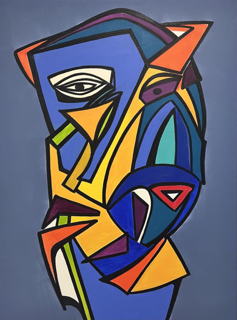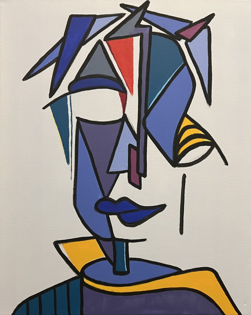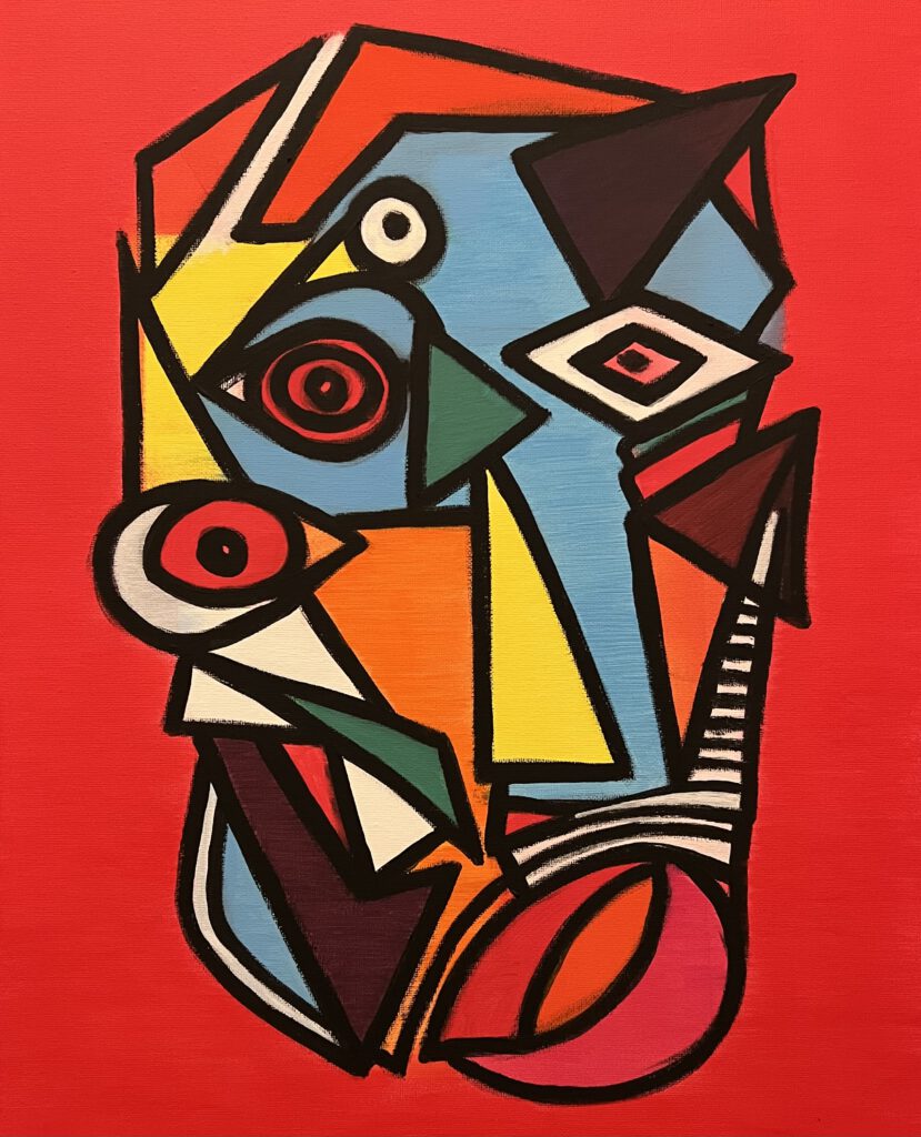 Dit portret weigert symmetrie en wint daardoor karakter. Ik bouw het hoofd uit verschoven platen, alsof het samengesteld is uit architectonische elementen. Het oog zoekt balans, maar vindt die niet — en precies dat maakt het werk voor mij levend. De zwarte lijnen functioneren als constructiebalken: ze houden de vorm bijeen en maken de spanning zichtbaar. Ik schilder hier geen emotie in klassieke zin, maar een manier waarop een gezicht zichzelf organiseert onder druk.